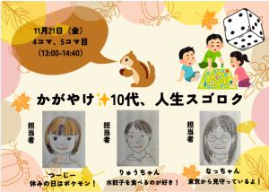 11月21日に実施された高学年むけのプログラム「かがやけ✨10代 人生スゴロク」について、受講者のRさんがプログラムづくりから実施までを書いてくださいました。
