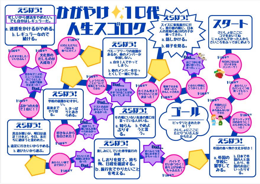 すごろくという遊びを通して、10代で直面するであろう葛藤を選択マスで表現。
