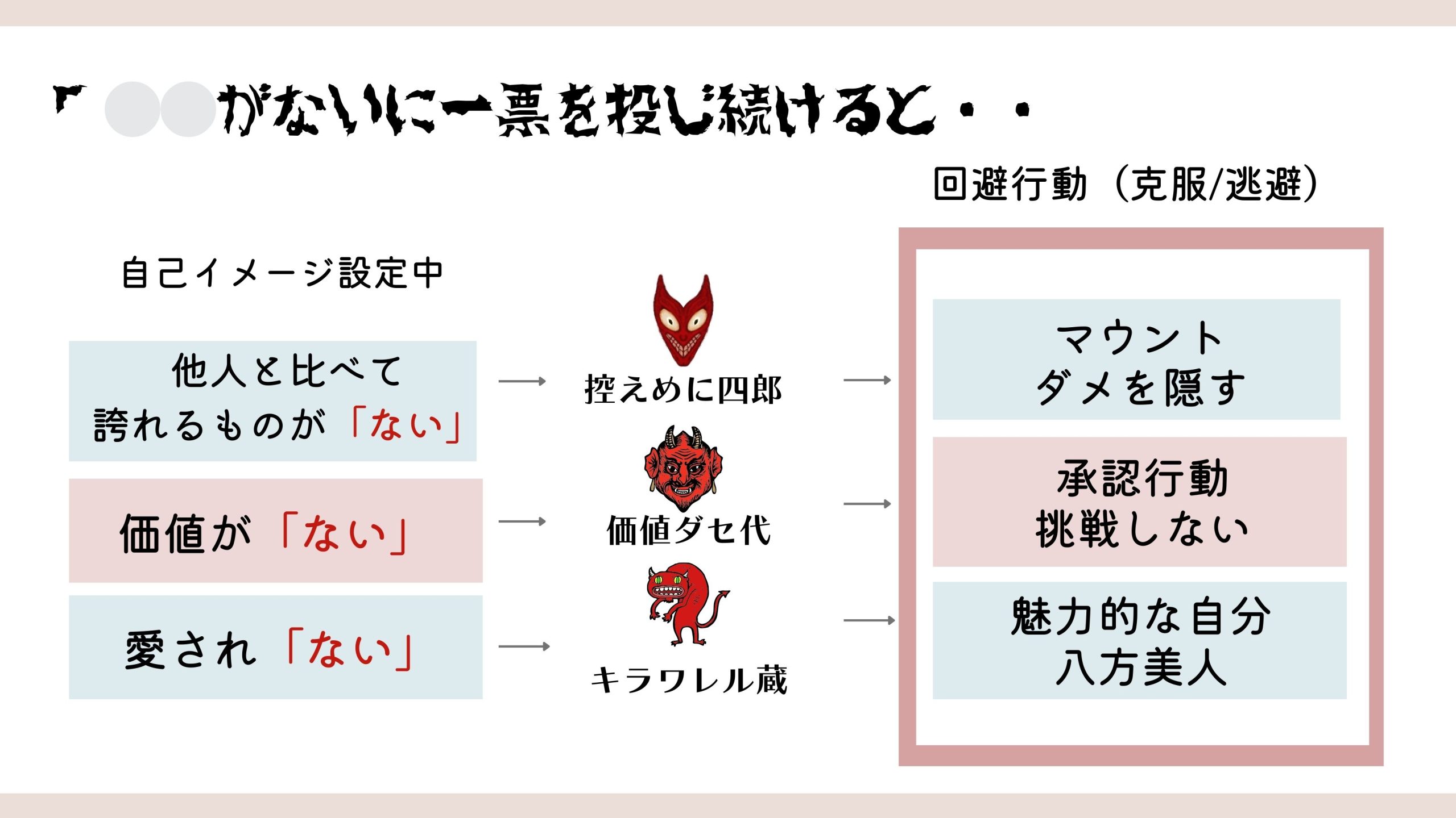 - 愛され「ない」から → 八方美人・過剰な努力
